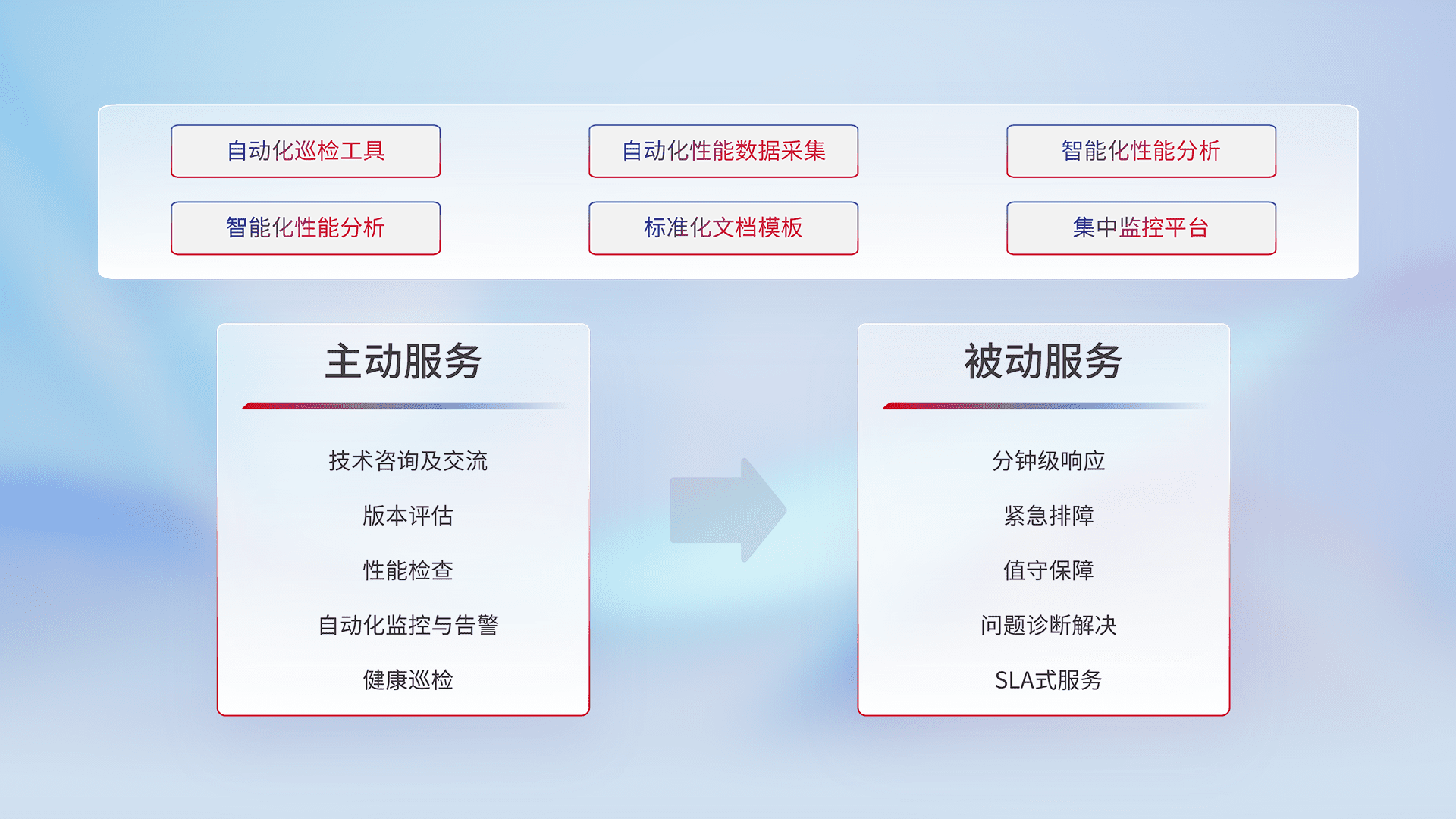 智能化工具和标准化文档,,,保障服务质量,,,,提供主动服务(包含技术咨询、、版本评估、、、、性能检查、、自动化监控与告警、、、健康巡检)和被动服务包含(分钟级响应、、、紧急排障、、值守保障、、问题诊断解决、、、、SLA服务)。。。。