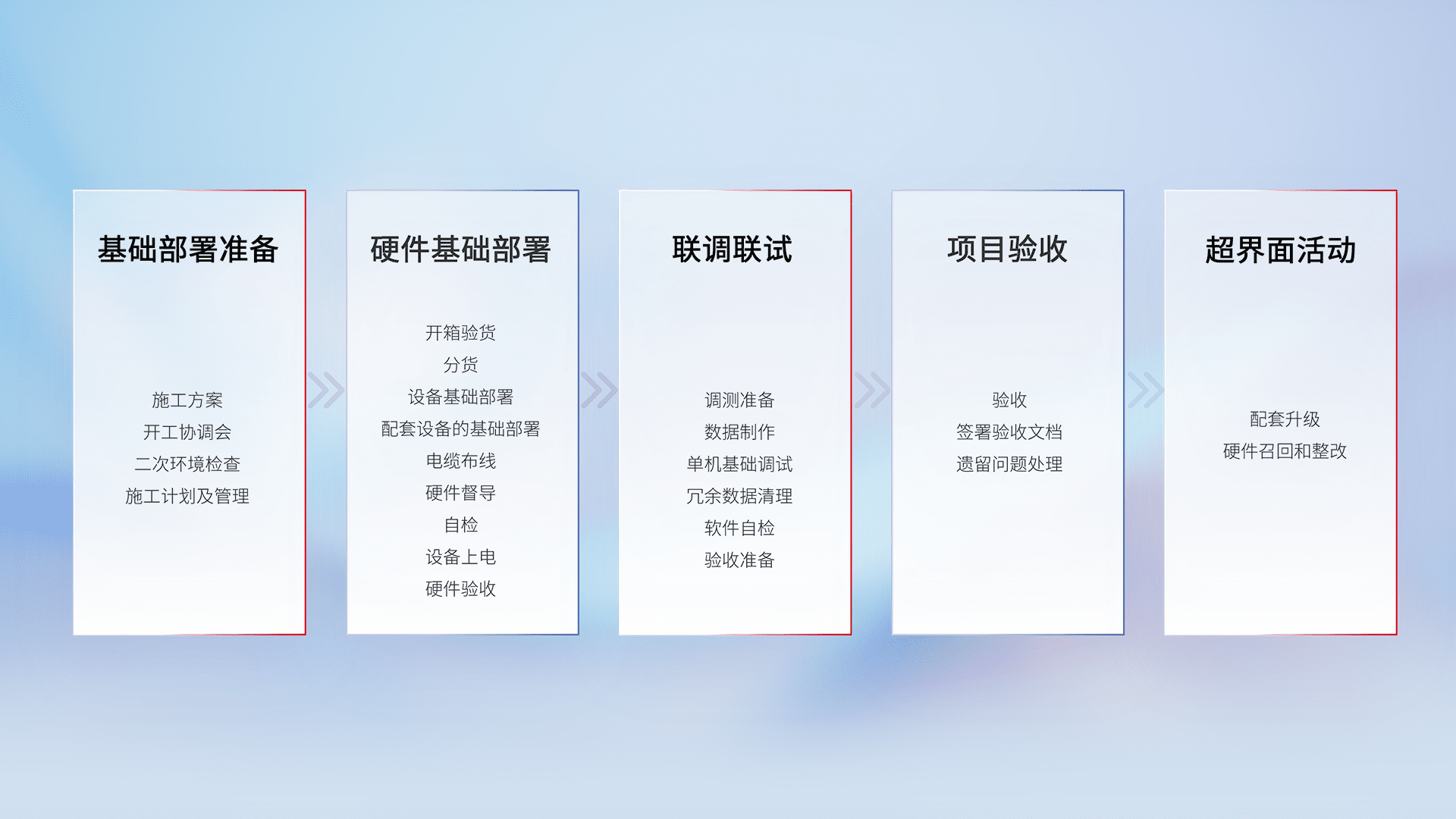 从基础部署准备、、硬件基础部署、、、联调联试、、项目验收、、、越界面活动的全过程可追溯,,,,保证施工质量和进度。。